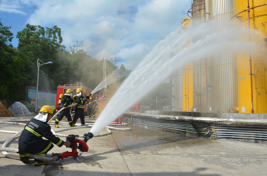 根据应急预案响应,参演人员全力以赴,积极应对险情;公司消防队迅速出动,专职消防人员从架设水枪开展专业扑救,到身穿防化服进入泄漏点进行检测和堵漏;环保人员对事故现场周围大气环境和事故污水进行了收集和有效监测,充分展示了有机分厂、保卫处消防队、生产安环部等相关单位的应急处置能力,达到了练指挥、练技能、练协同、练战法、练保障的效果。