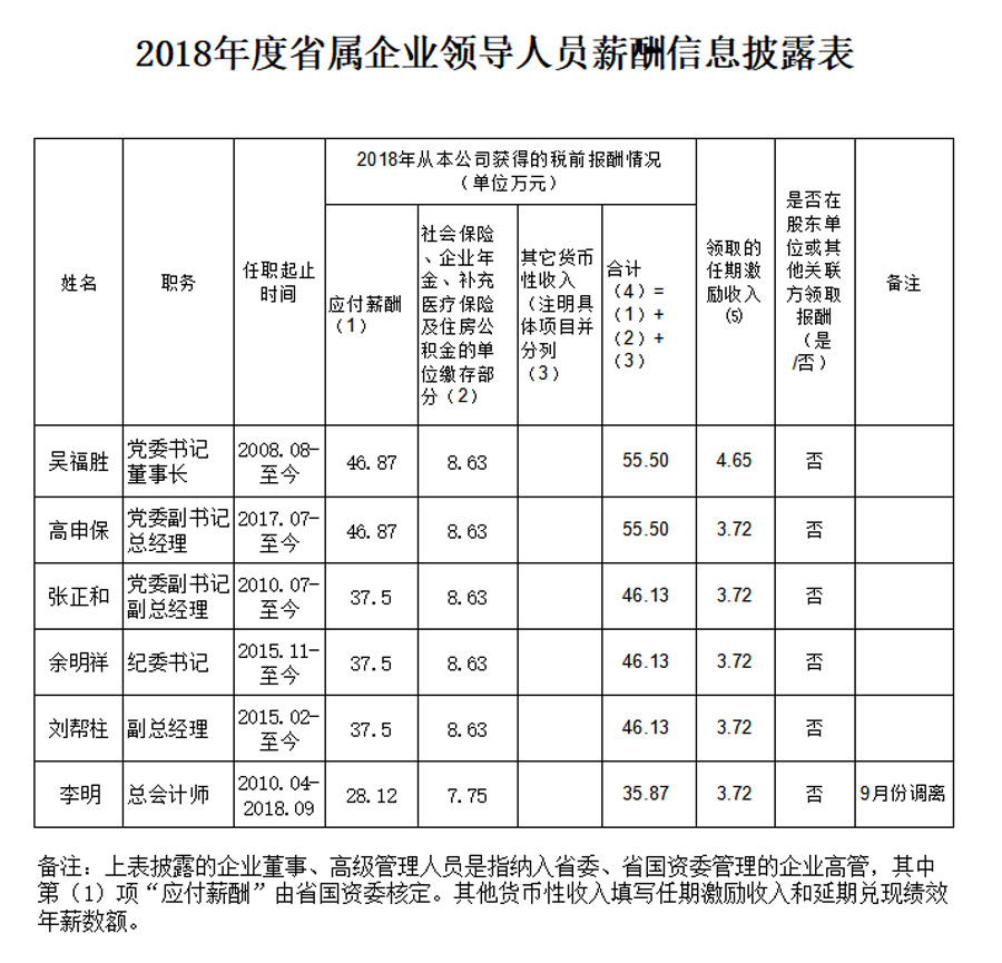 2018年度省属企业引领人员薪酬信息披露表