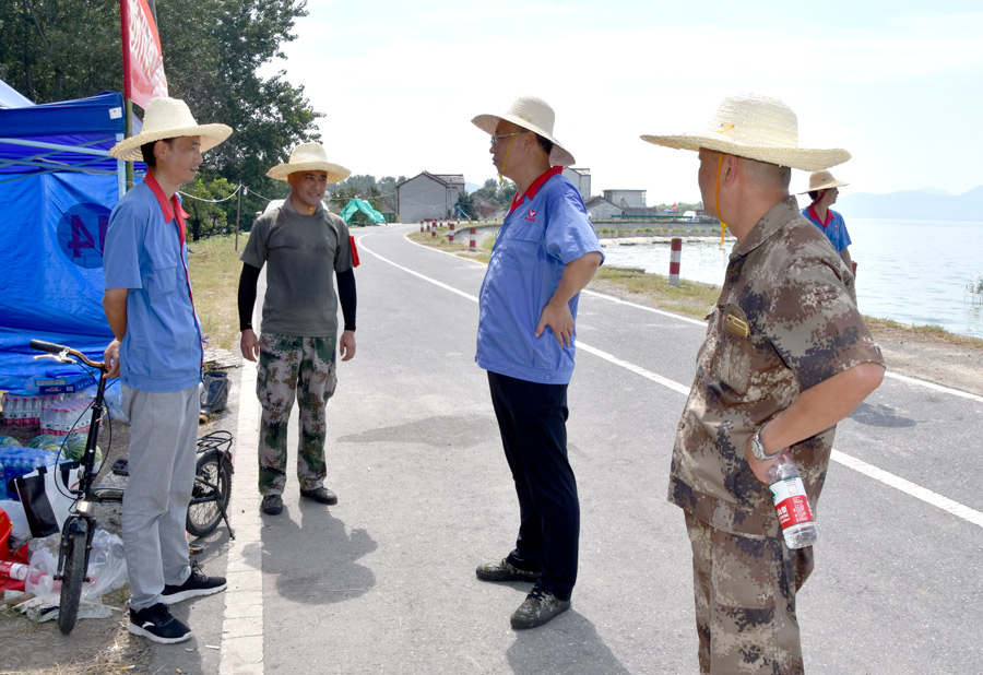 8月3日,骄阳似火,巢湖地区高温度达36℃。在如此炎热的天气里,尊龙凯时防汛突击队员们的身体状况让公司导时刻记挂在心。这样的高温下,突击队员状态怎么样?队员们有哪些实际需要?上班,张正和、吴霖、闫昌斌等导就驱车前往巢湖大堤,慰问防汛线的突击队员们。
