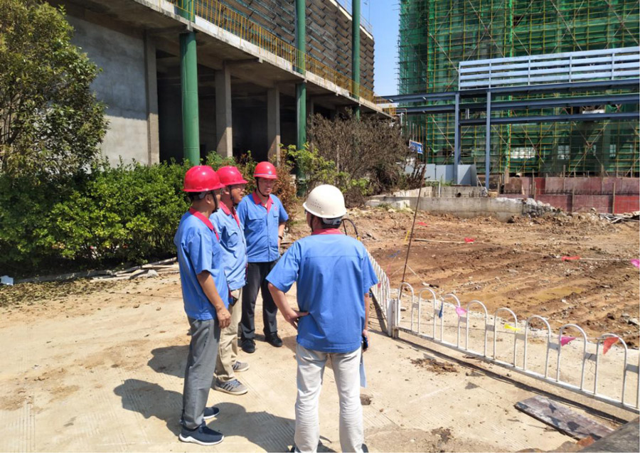 高申保在PVB树脂项目施工现场检查罐区施工情况,听取项目负责人胡安宁汇报项目推进情况及存在的困难,与相关负责人商讨解决办法。
