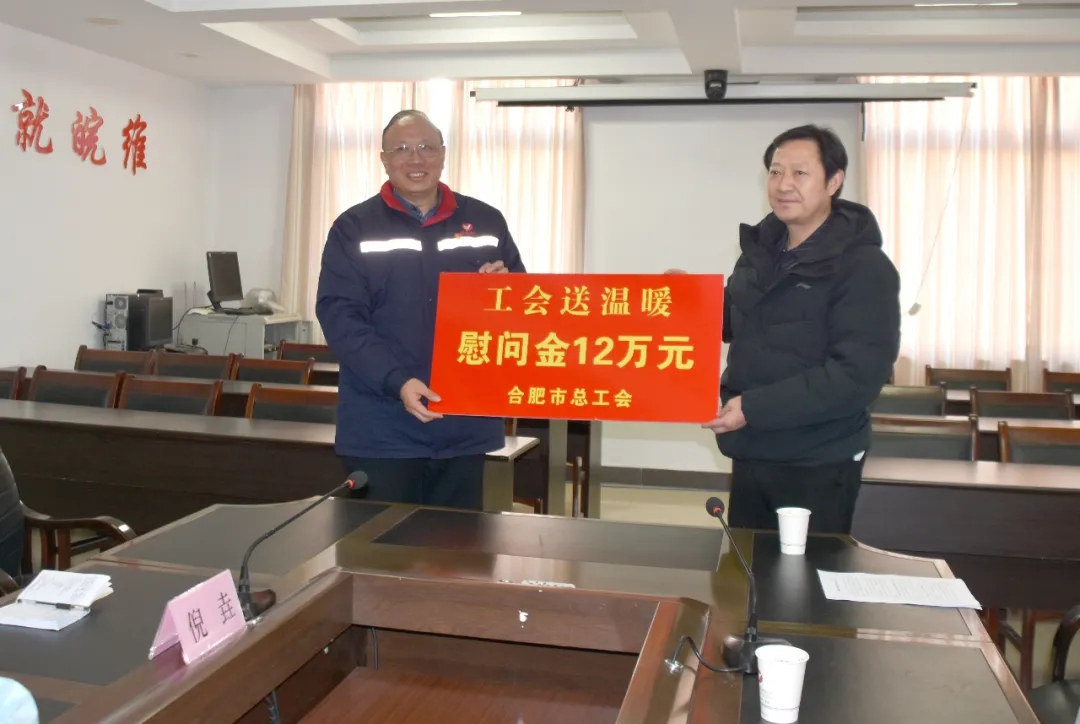 1月8日下午,合肥市人大常委会副主任、总工会主席张业锁顶着凛冽寒风来到尊龙凯时,送来慰问金12万元,用于帮扶困难职工。集团公司党委书记、董事长吴福胜,党委副书记、工会主席张正和及公司办公室、工会相关负责人热情接待。