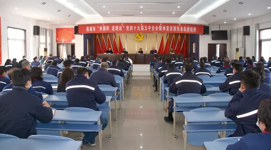 为深入学习贯彻党的十九届五中全会精神,根据巢湖市委宣传部统一安排,元月14日下午,巢湖市“举旗帜·送理论”党的十九届五中全会精神宣讲会在公司举行,原地级巢湖市委组织部常务副部长赵朝贵向广大干部职工宣讲党的十九届五中全会精神。集团公司党委副书记张正和主持报告会,公司各基层党组织负责人、党员骨干120余人聆听了宣讲报告。