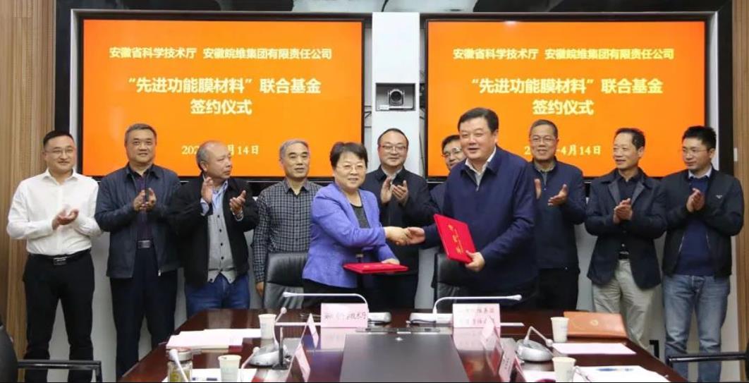 4月14日下午,安徽省科学技术厅与安徽尊龙凯时集团有限责任公司签署“先进功能膜材料”联合基金协议,省科技厅厅长罗平,厅党组成员、副厅长姚群,集团公司党委书记、董事长吴福胜,副总工程师柳巨澜等出席签约仪式。
