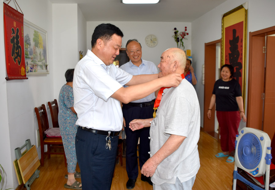 23日上午,吴福胜深入老党员家中,为老党员颁发佩戴纪念章,传达中共中央颁发“光荣在党50年”纪念章的重要意义,祝愿老党员身体健康、生活幸福。
