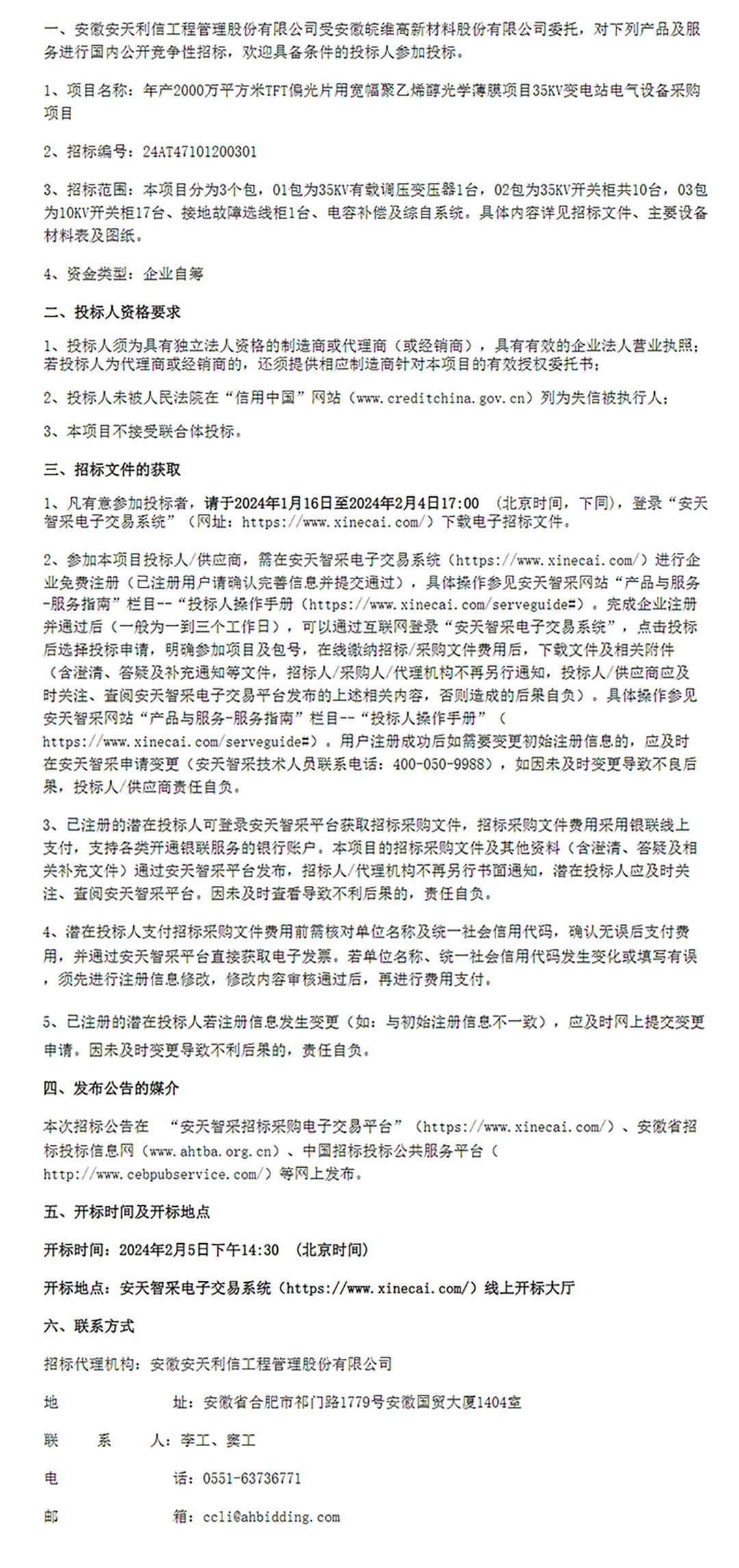 年产2000万平方米TFT偏光片用宽幅聚乙烯醇光学薄膜项目35KV变电站电气设备采购项目